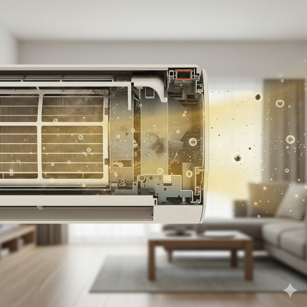 結論から言うと、暖房をつけた時に感じる嫌な臭いの二大原因は、エアコン内部に蓄積されたカビホコリです。これらが混ざり合い、暖房の熱によって温められることで、あの独特の不快な臭いが発生します。