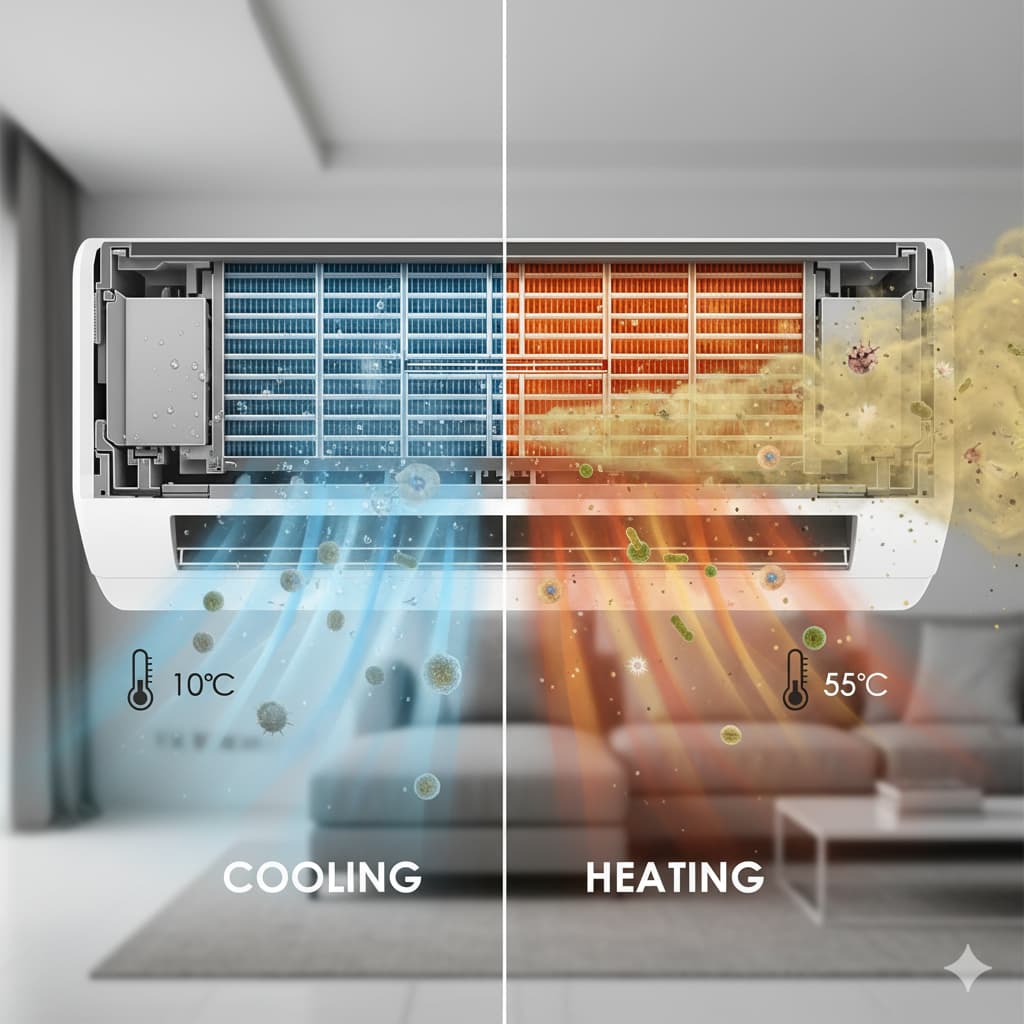 一方、暖房運転では冷房とは逆に、熱交換器は50℃~60℃という高温になります。この熱により、夏から秋にかけて蓄積・繁殖したカビや雑菌、ホコリに含まれるバクテリアなどの汚れが一気に加熱されます。その結果、湿った雑巾を熱々のストーブの上で乾かしているような状態になり、強烈な臭い成分が揮発して温風と共に室内に勢いよく放出されるのです。