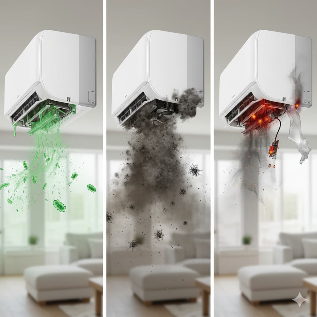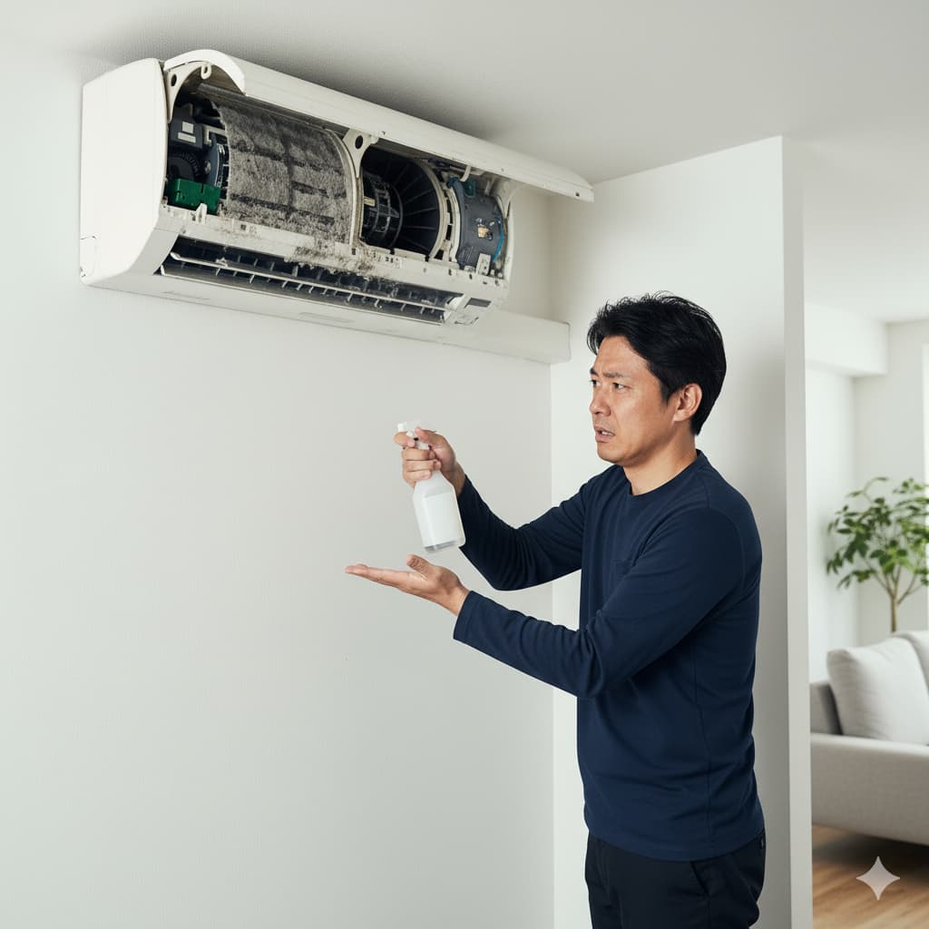 専門知識のないままスプレーを使用することは、臭いを悪化させるだけでなく、エアコンの重大な故障や寿命を縮める原因となる多くのリスクを伴います。良かれと思って行ったセルフクリーニングが、取り返しのつかない事態を招く可能性があるのです。