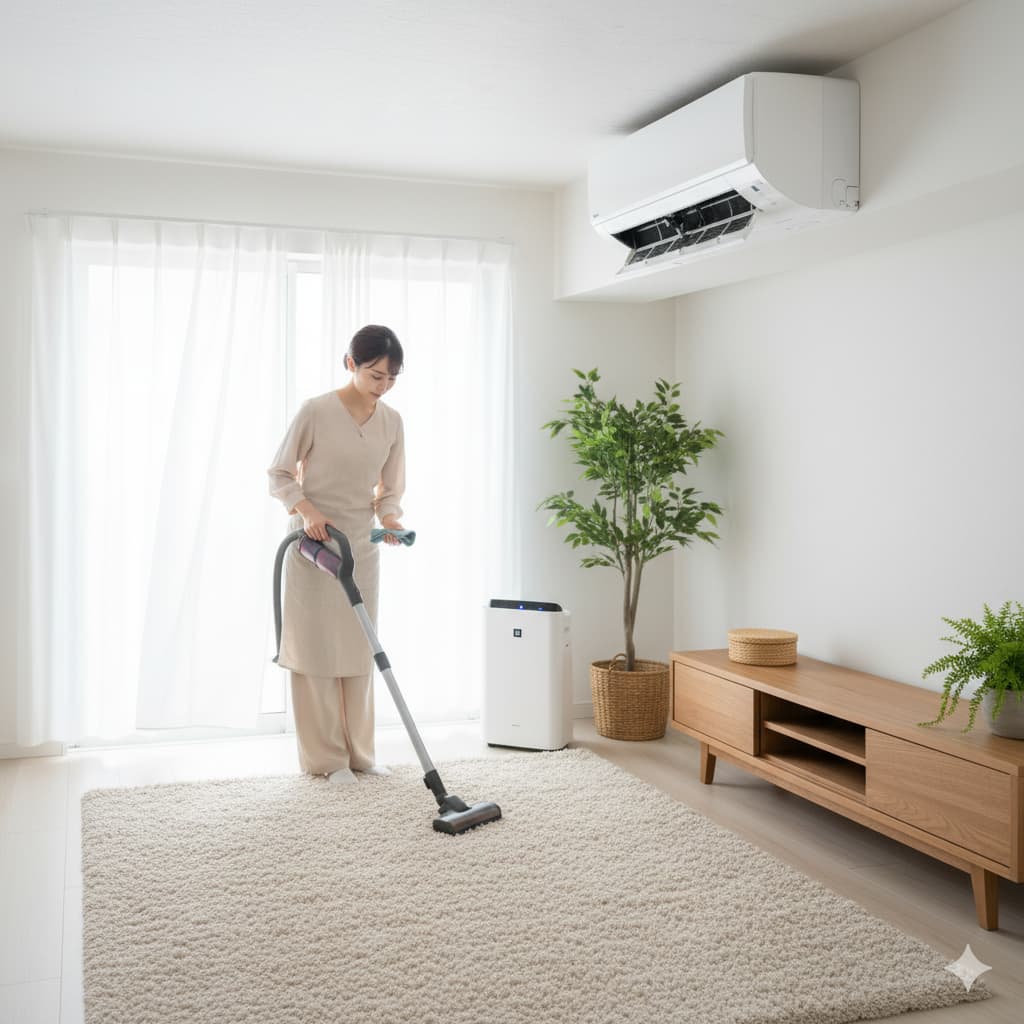 エアコンが吸い込むホコリやハウスダストの発生源は、言うまでもなく部屋の中にあります。床やカーペット、カーテン、家具の上などに溜まったホコリをこまめに掃除機やフローリングワイパーで取り除くことで、空気中に舞い上がるホコリの総量を減らすことができます。結果として、エアコンフィルターの目詰まりを軽減し、内部に侵入する汚れの量を大幅に減らすことが可能です。