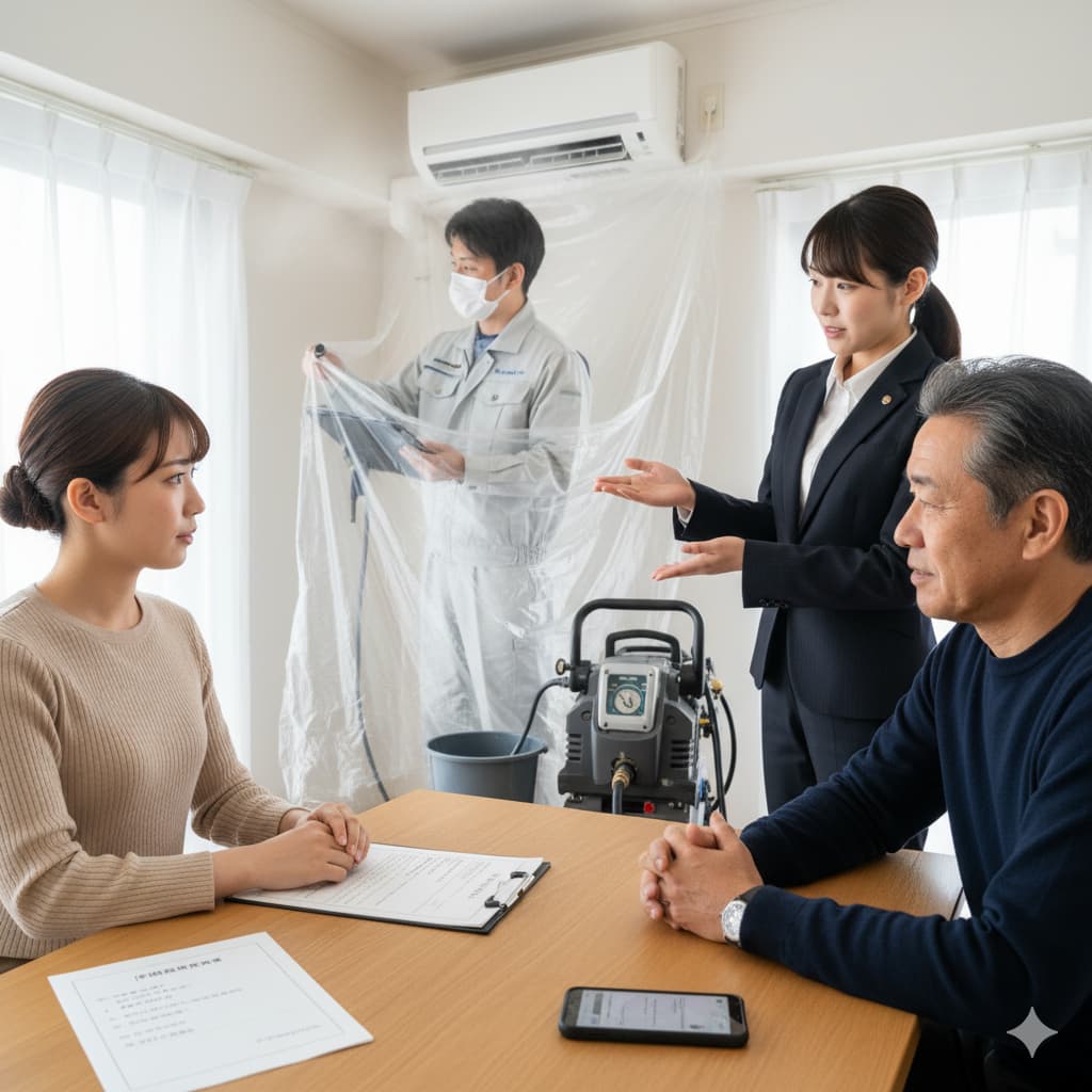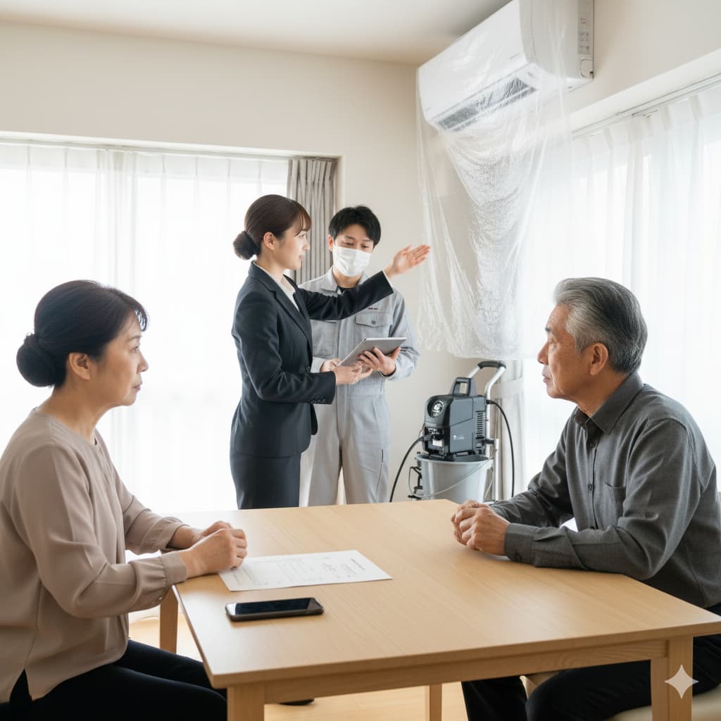 「業界最安値!5,000円~」といった広告には注意が必要です。この価格は通常タイプのエアコンの最も基本的な洗浄のみの料金であり、後から「防カビ抗菌コート」「消臭除菌処理」「出張費」「駐車場代」といった様々なオプション料金が追加され、最終的な請求額が予想を大幅に上回るケースが少なくありません。「作業一式で総額いくらになるのか」「追加料金が発生する可能性がある場合はどのような時か」を、予約前の見積もり段階で明確に提示してくれる誠実な業者を選びましょう。また、お掃除機能付きエアコンは内部構造が非常に複雑なため、通常タイプよりも1.5倍~2倍程度の料金になるのが一般的です。