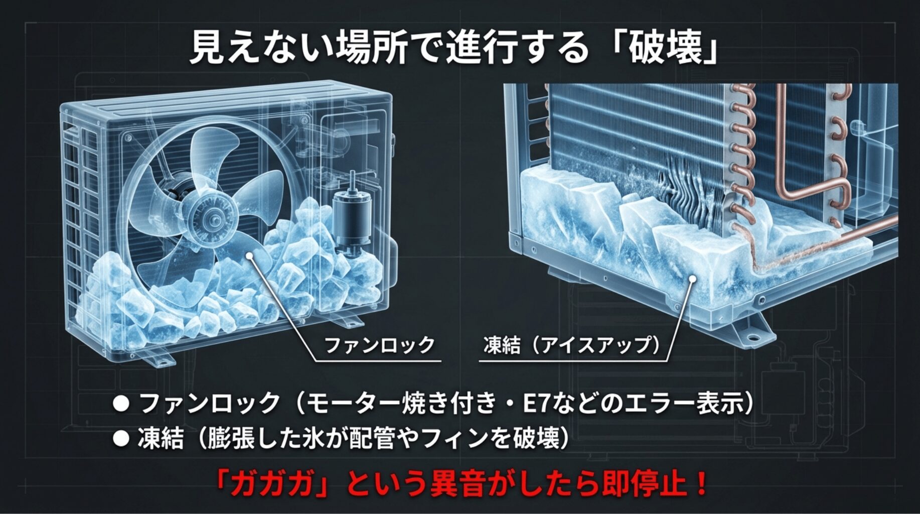| エラー表示(E7など) | ファンの回転異常・ロック | 運転停止後、周囲の除雪と解凍を待つ |