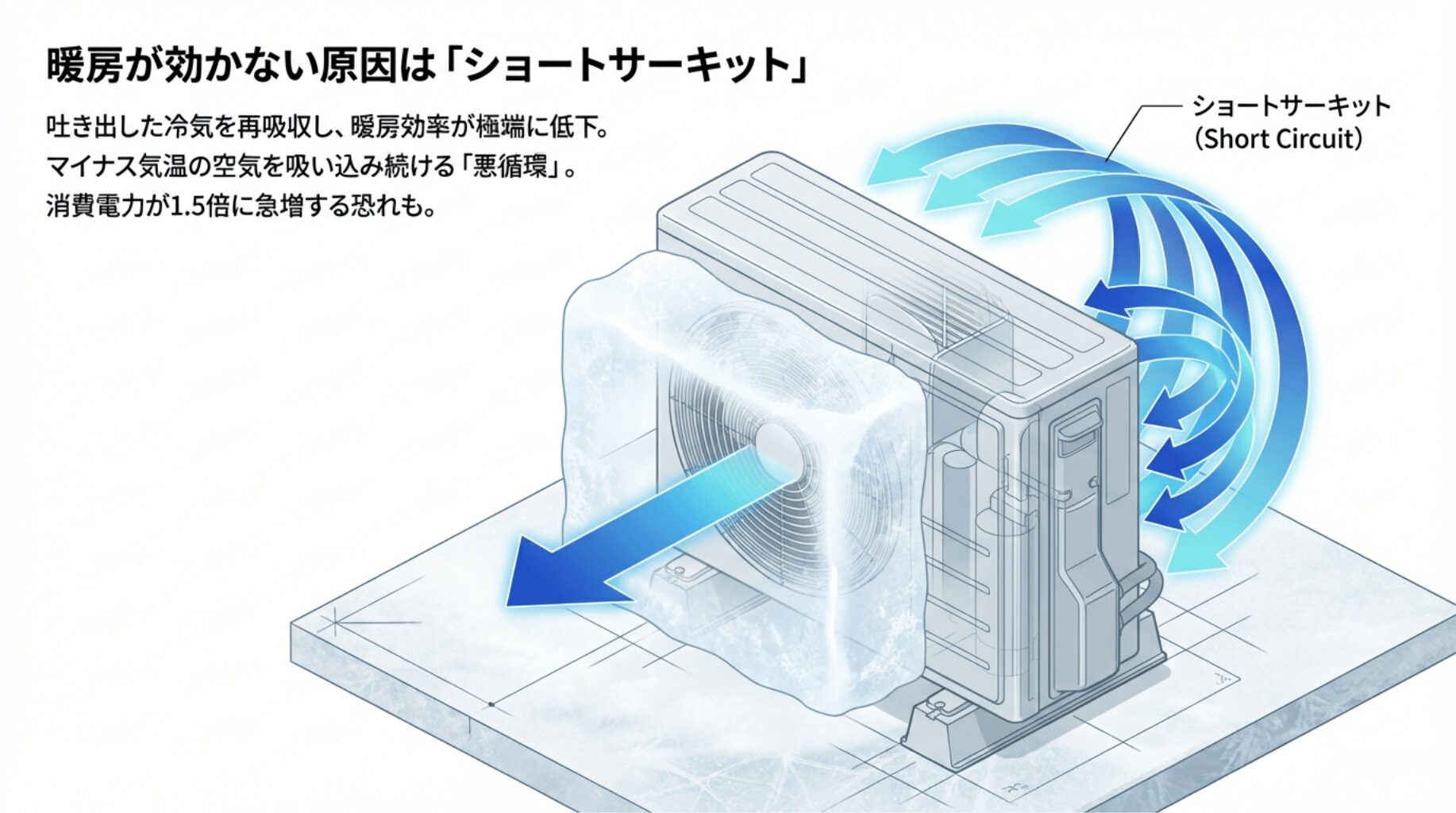 エアコンが暖房運転をしているとき、室外機は周囲の空気から熱を奪い、代わりに冷え切った空気を前面のファンから吹き出しています。通常、この冷風は遠くへ拡散されますが、積雪によって吹出口や吸込口がふさがってしまうと、行き場を失った冷風が障害物に跳ね返り、再び室外機の背面から吸い込まれてしまいます。これが「ショートサーキット」と呼ばれる現象です。