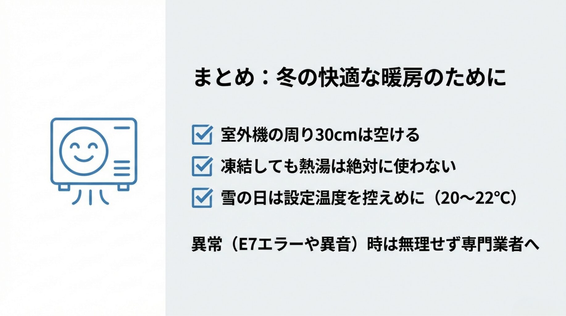 - 豪雪地帯でも安定して暖房を稼働させるための設置環境と最新の予防策