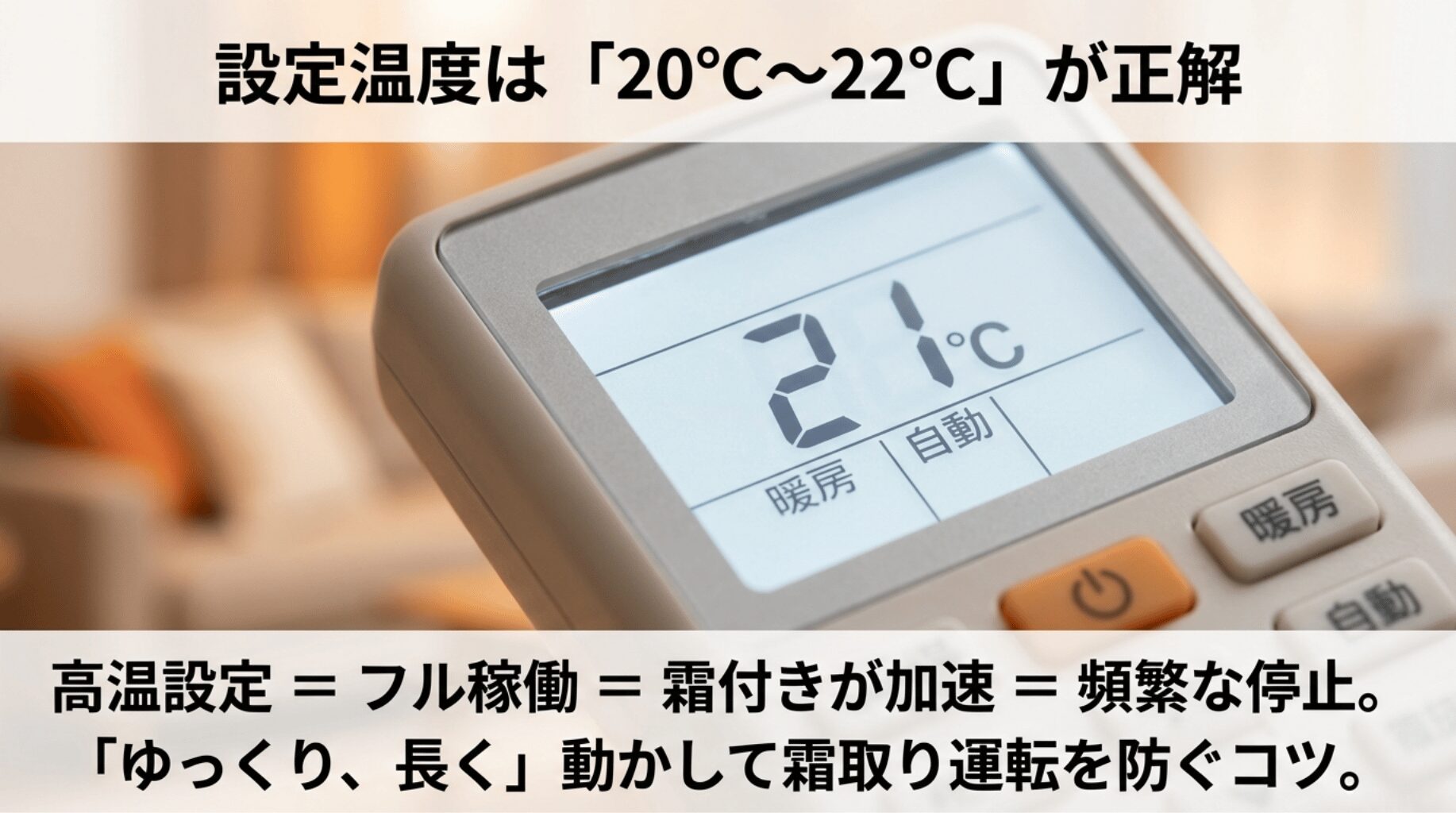 「外は雪だし、寒いから設定温度を30度にしよう!」――その気持ちは痛いほど分かりますが、実はこれが逆効果になることがあります。エアコンは設定温度と現在の室温の差が大きいほど、フルパワーで運転します。室外機がフルパワーで動くということは、フィンの温度がさらに下がることを意味し、結果として霜が付着するスピードが劇的に早まってしまうのです。