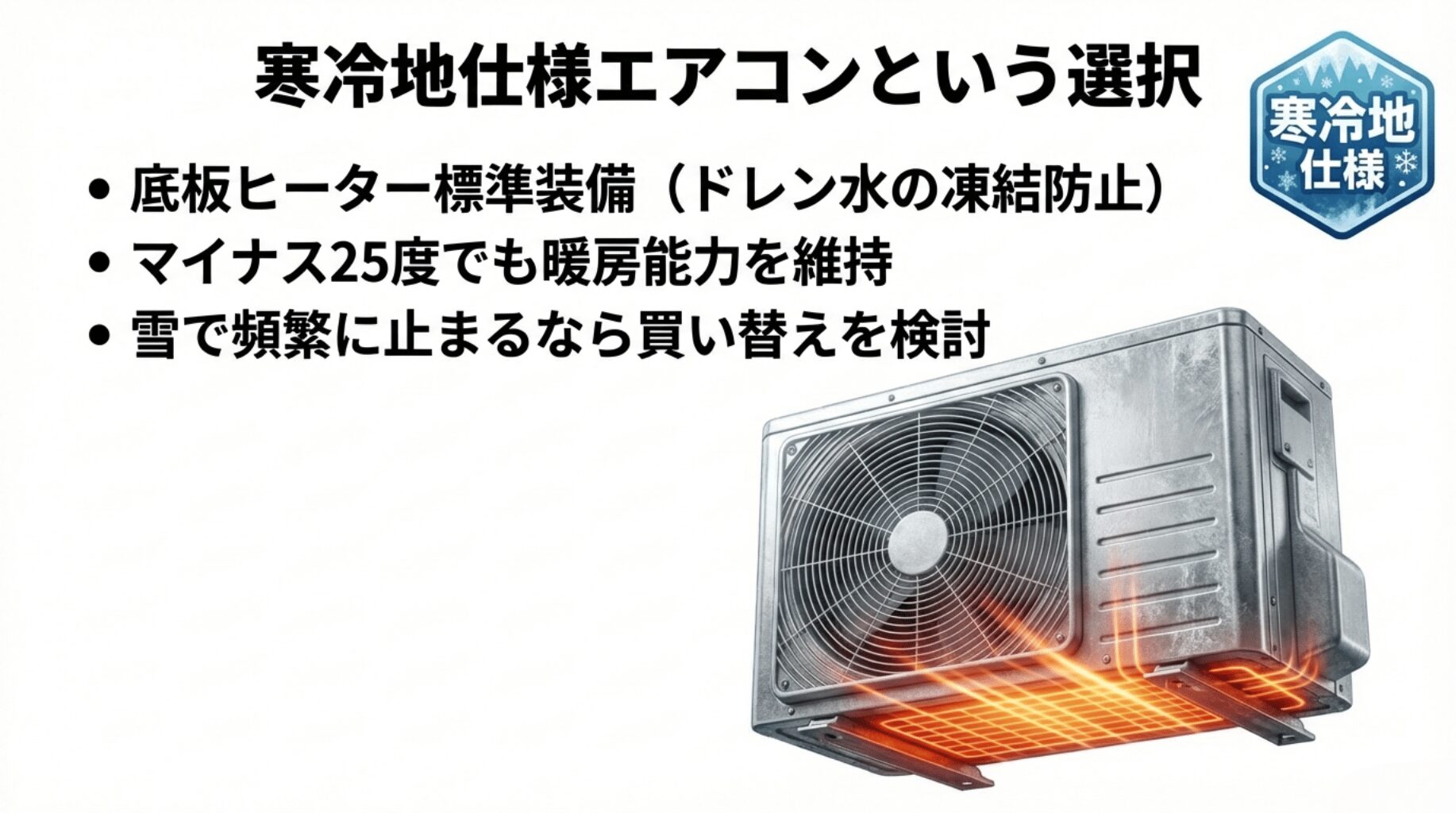 雪国での生活において、標準的なエアコンではどうしても力不足を感じることがあります。そんな場合に検討していただきたいのが「寒冷地仕様」のエアコンです。これは単に暖房パワーが強いだけでなく、雪に耐えるための専用設計が随所に施されています。私が一番素晴らしいと感じるのは、多くのモデルで標準装備されている「底板ヒーター」です。