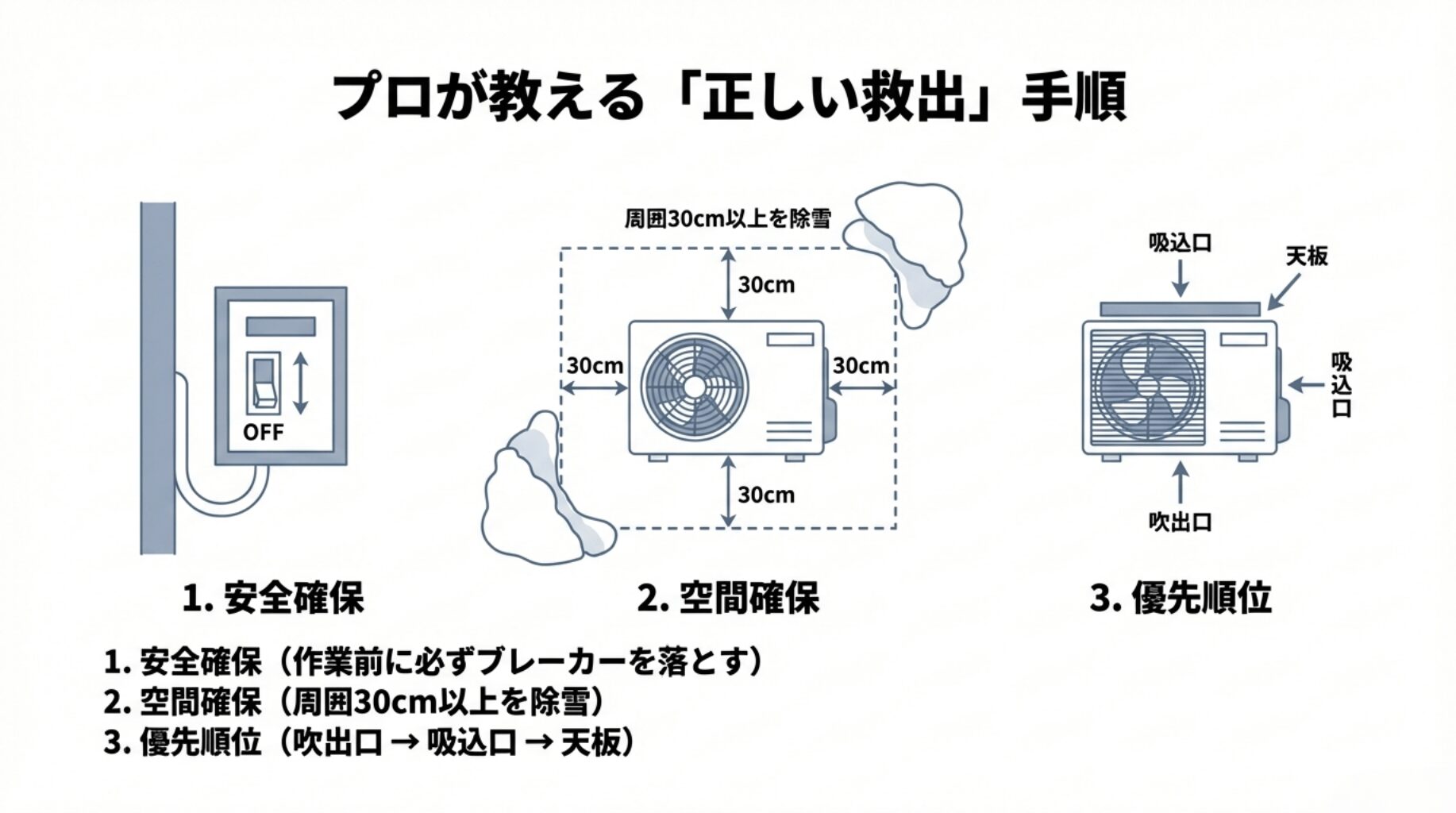 雪によるリスクを正しく理解したところで、次は具体的な「守り方」についてお話しします。私はこれまでの経験から、雪害対策は「事前の準備」と「正しい除雪」の二段構えでなければならないと考えています。間違った知識で対処してしまうと、せっかくのエアコンを自分の手で壊してしまうことにもなりかねません。ここでは、今日から実践できる正しいメンテナンス術と、プロの視点での予防策を伝授します。