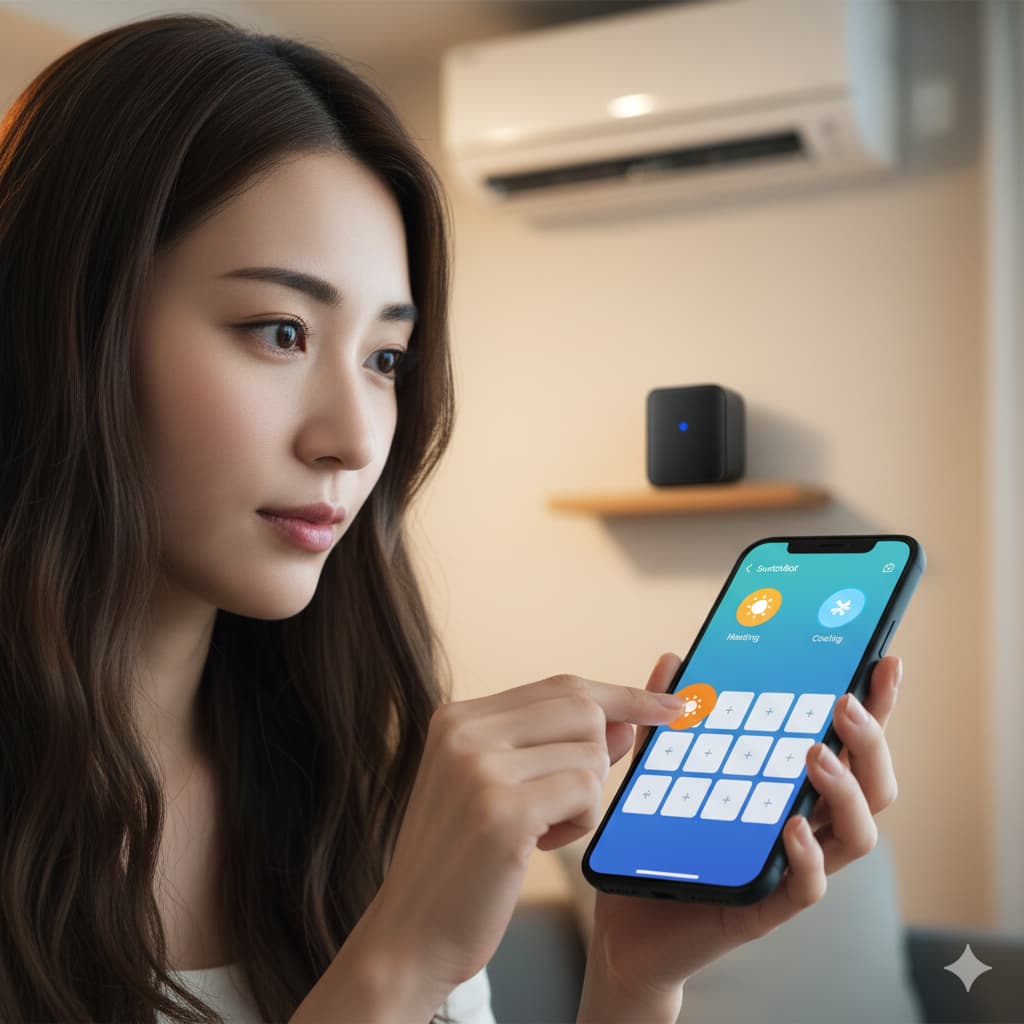 - 状態の同期機能(スマートラーニング強化): ハブ2は本体に温湿度計とディスプレイが内蔵されています。もし家族がSwitchBotアプリからではなく、エアコン付属の物理リモコンで操作した場合でも、ハブ2がその信号を受信・解析し、現在のエアコン設定(例:暖房 23度)を自動でアプリと本体ディスプレイに表示・同期させることができます。