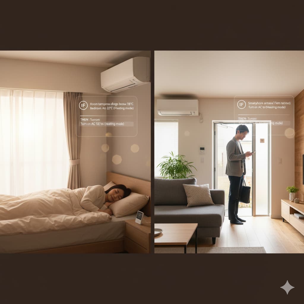 オートメーションとは、「特定の条件(トリガー)」を満たした時に、「特定のアクション(暖房ONなど)」を自動で実行させる機能です。これにより、手動で操作する手間を省き、快適な室温管理を自動化できます。「カスタマイズ」や「その他」モードで暖房ボタンを登録したら、ぜひ設定してみましょう。